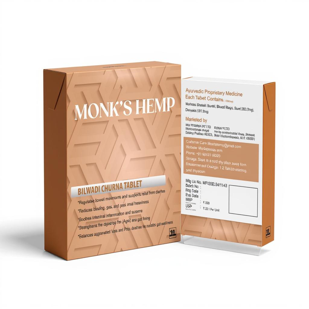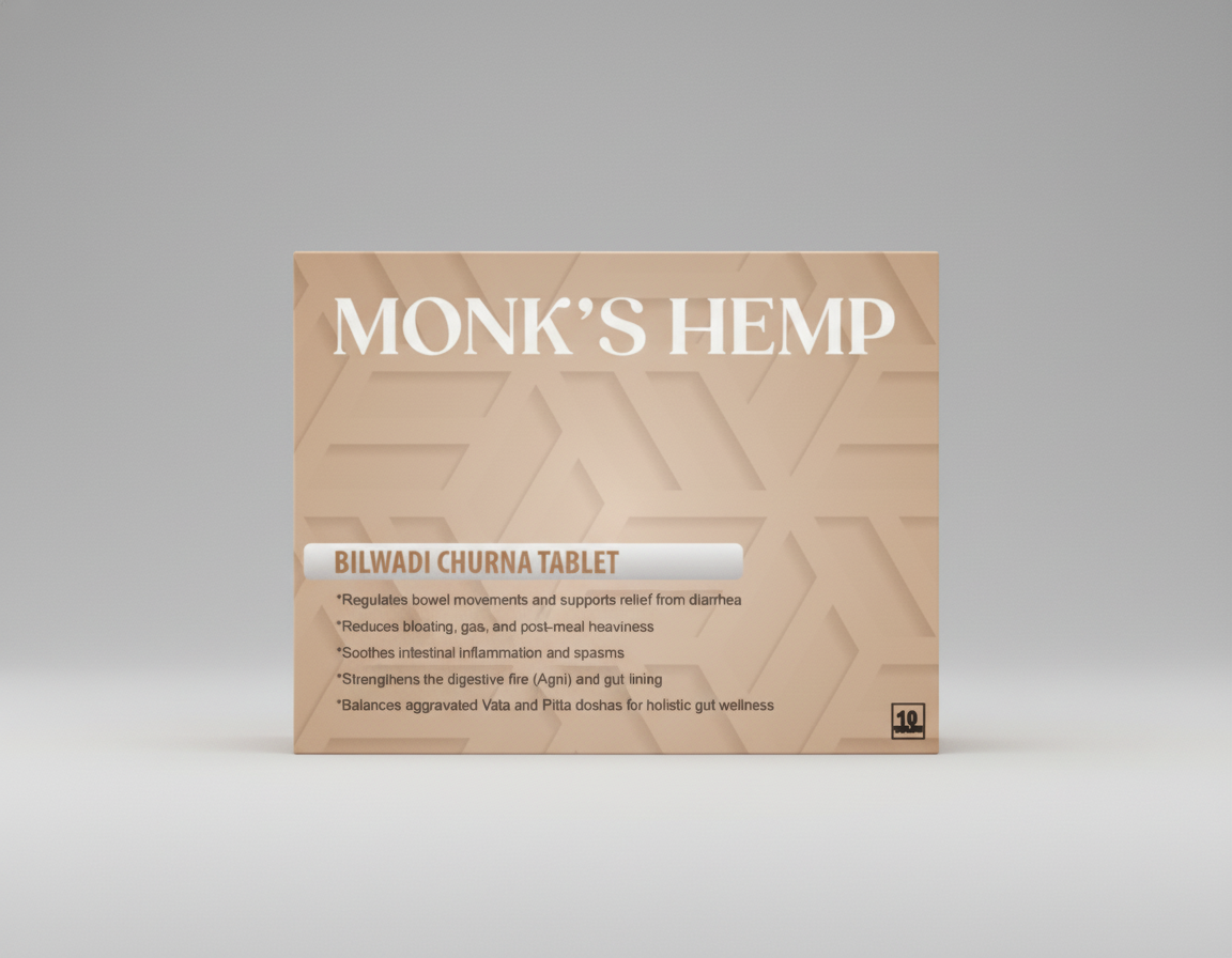 Find natural relief with Monk’s Hemp Bilwadi Churna Tablet, crafted with a traditional Ayurvedic blend of Bilva, Bhanga, Shunthi, Saunf, and Dhanyaka to restore balance, improve digestion, and promote overall gut wellness.